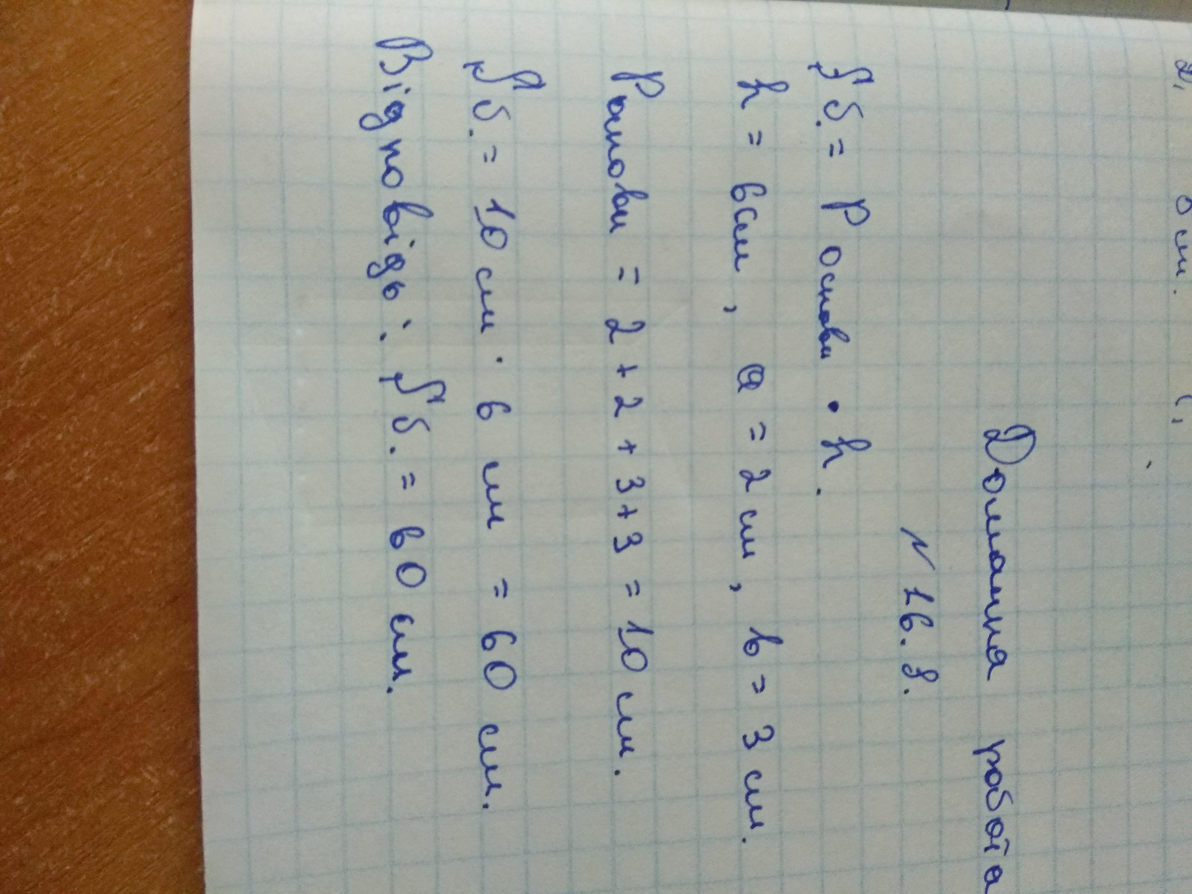 Знайдіть площу бічної поверхні прямої призми, висота якої = 6 см. ,а основою є паралелограм зі сторонами 2см і 3см.
