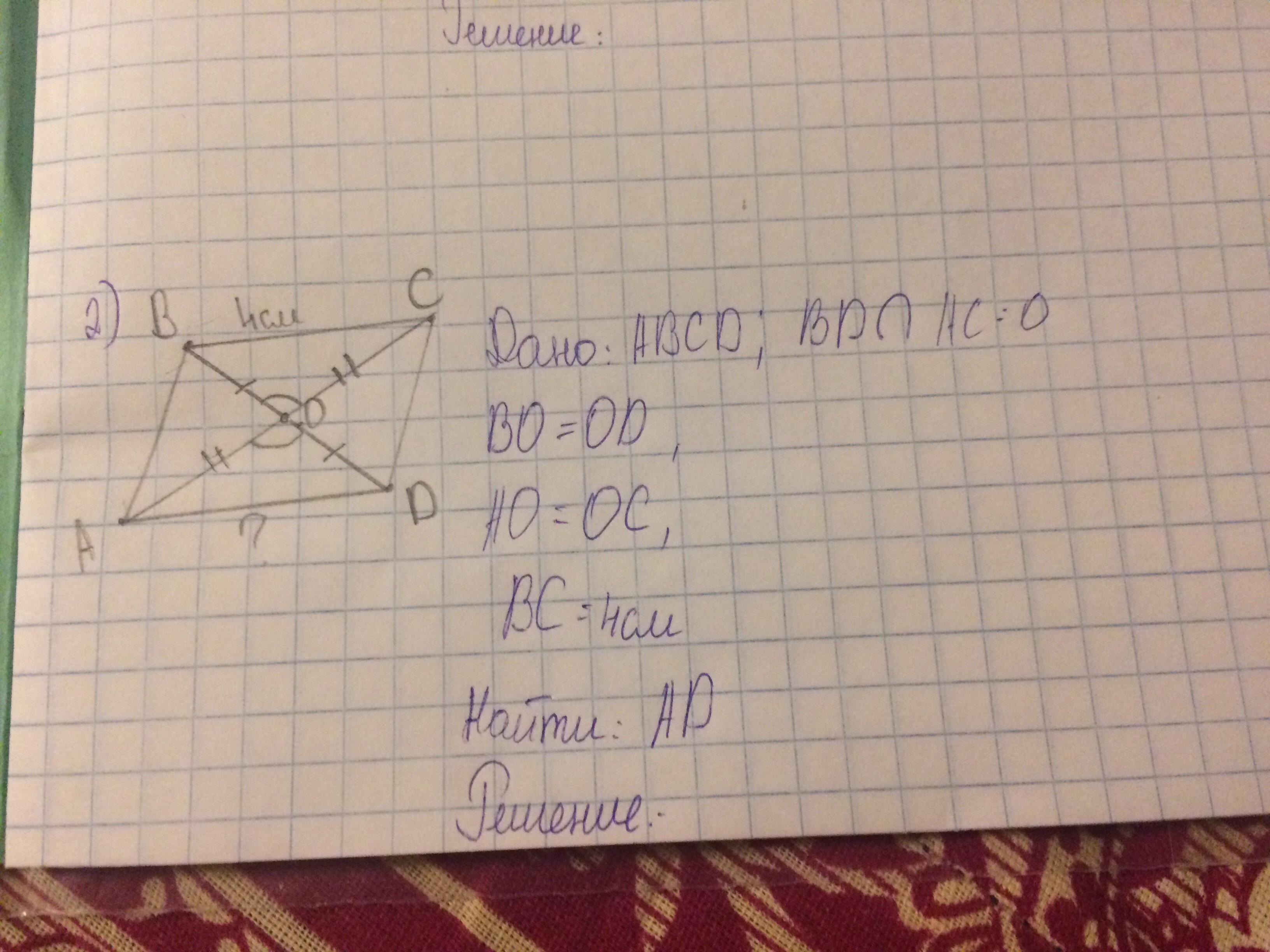 ΔBOC = ΔDOA по 1-му признаку: BO=OD и AO=OC (по условию);