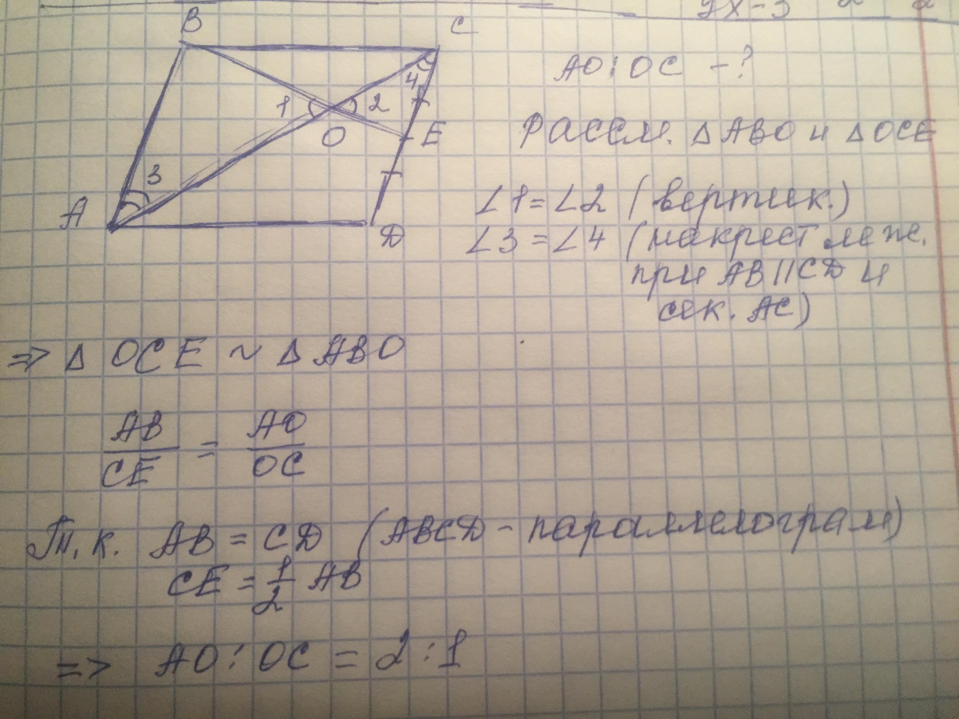 Четырехугольник ABCD-параллелограмм. Точка E- середины стороны CD. Отрезок BE пересекает диагональ AC в точке O. Найдите AO: OC