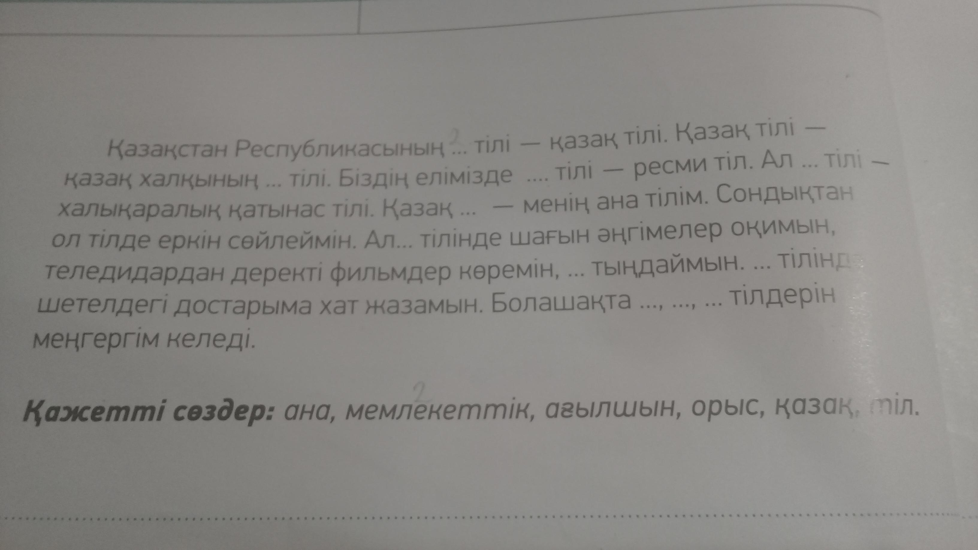 1)мемлекеттик 2)ана 3)казак 4)орыс 5)тІлІ 6)орыс 7)олен 8)агылшын 9)казак, орыс, агылшын