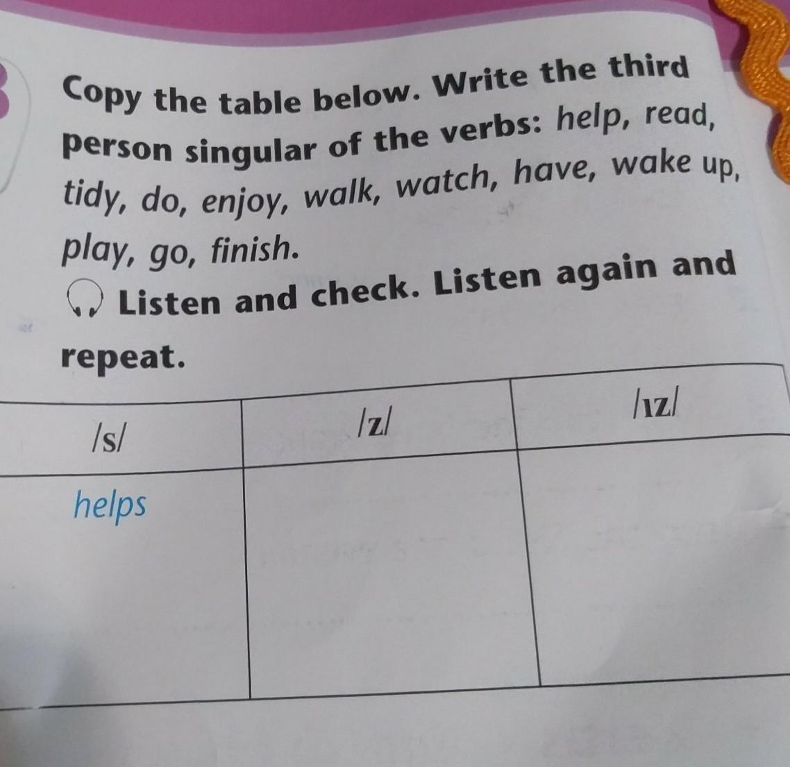 Copy the below.Write the third person singular of the verds:help,read,tidy,do,enjoy,walk,watch,have,wake up,play,go,finish.