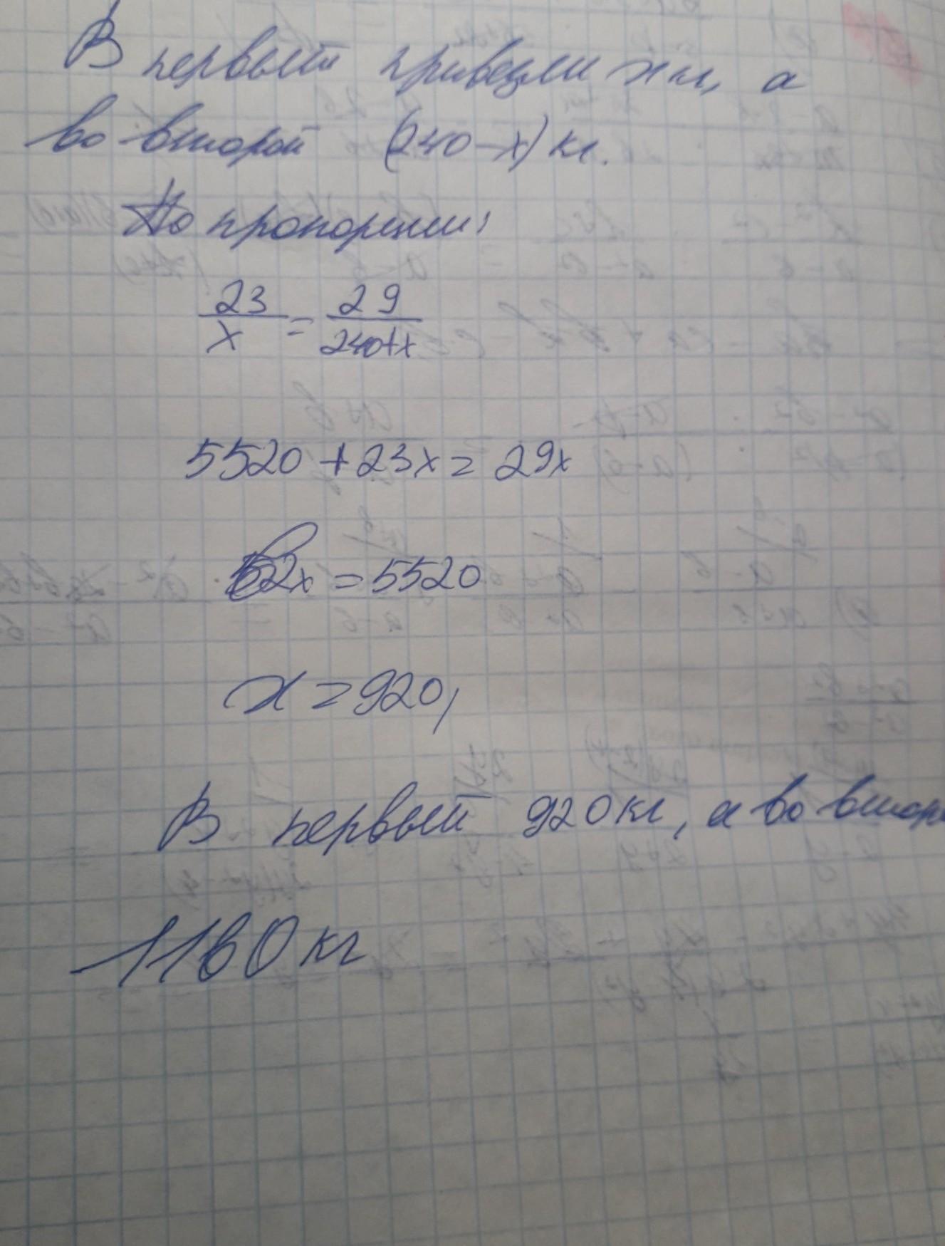 В один магазин привезли 23 мешка картофеля, а в другой 29 таких же мешков. Во второй магазин привезли на 240 кг больше, чем в первый. Сколько килограммов картофеля привезли в каждый магазин?