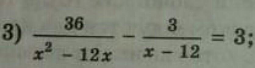 Тебе нужно домножить знаменатели (под чертой) до общего знаменателя. Здесь он x^2-12x. (^2 - вторая степень). Получается 36/(x^2-12x) - 3x/(x^2-12x)=3x^2-36x/(x^2-12x). Переносишь через равно (знаки меняешь на противоположные). Дальше см. приложение: