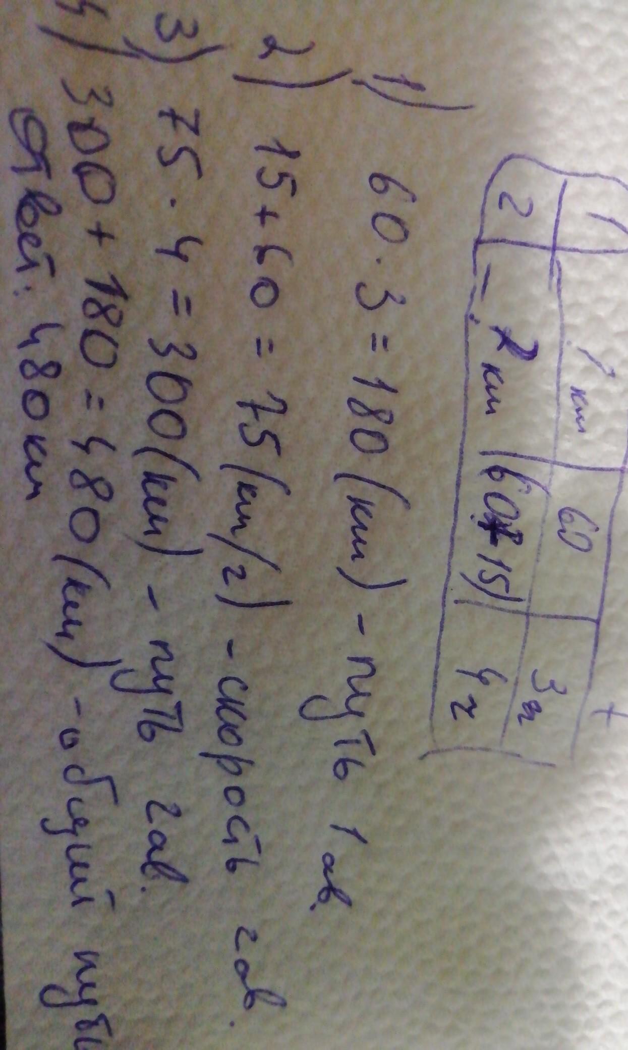 Скорость 1 автобуса 60 км за час, скорость 2 автобуса -? на 15 км за час, время движения 1 автобуса 3 часа, второго 4 часа,какой путь проехали вместе? Км