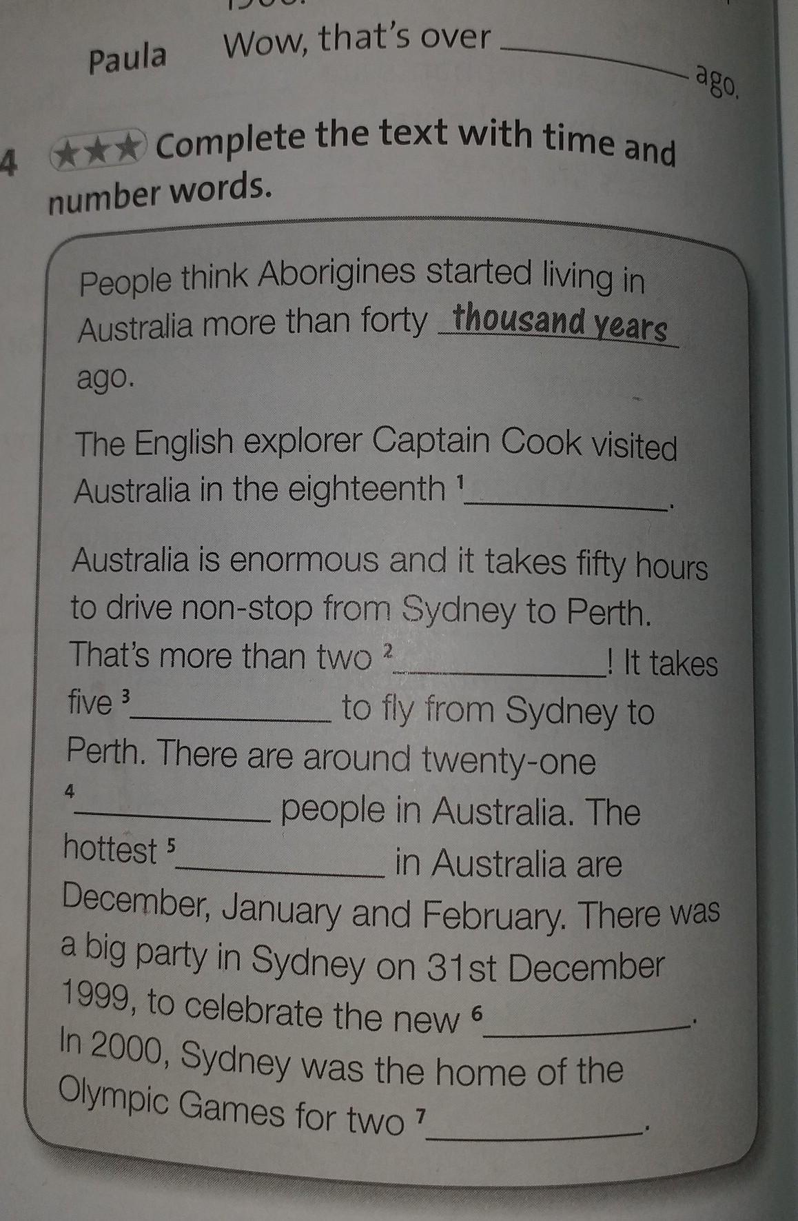 People think Aborigines started living in Australia more then thousand years ago. The English explorer Capitan Cook visited Australia in the eighteenth century. Australia is enormous and it takes fifty hours to drive non-stop from Sydney tco Perth. That's more than two days! It takes five hours to fly from Sydney to Perth. They are around twenty-one million people in Australia. The hottest months in Australia are December, January and February. There was a big party in Sydney on 31st December 1999, to celebrate the new millenium. In 2000, Sydney was the home of the Olympic Games for two seasons.