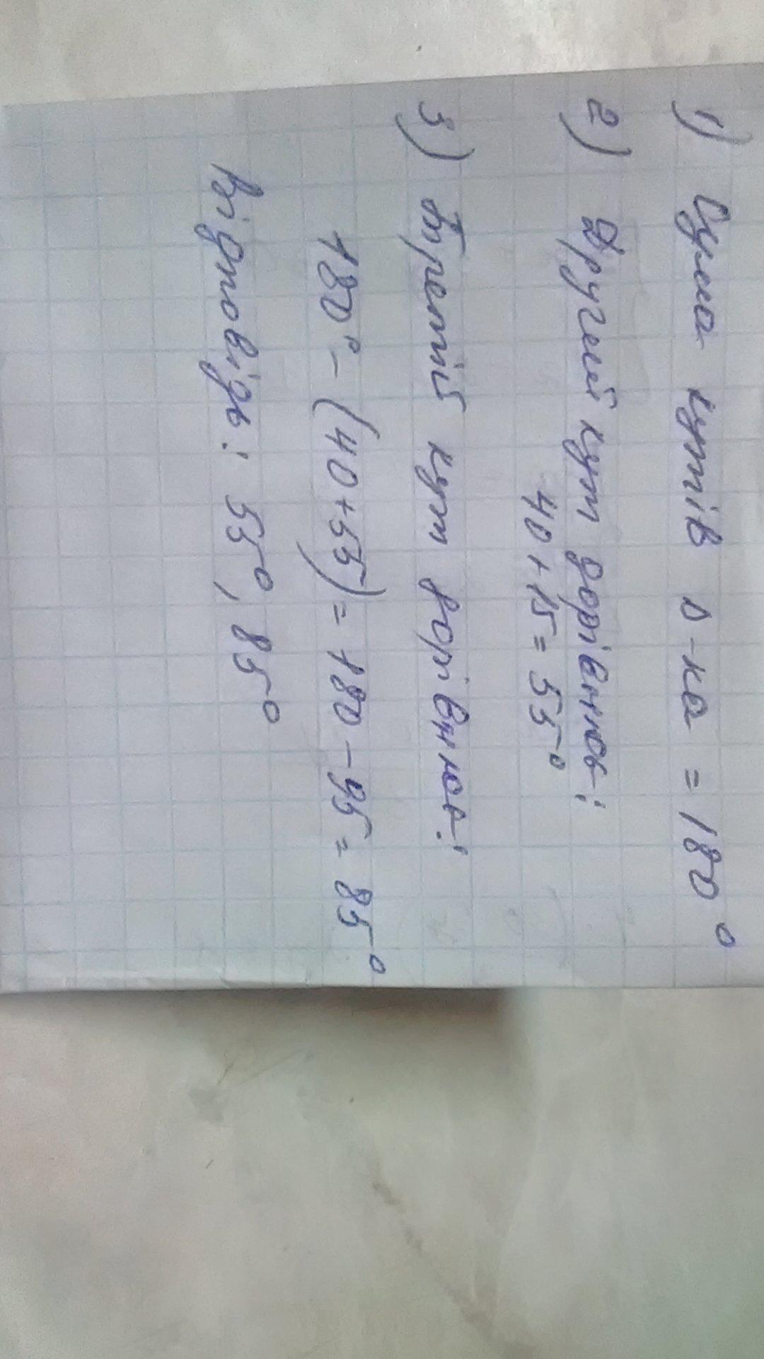 Один з кутів трикутника 40 градусів, другий на 15 градусів більший за третій. Знайти невідомі кути трикутника
