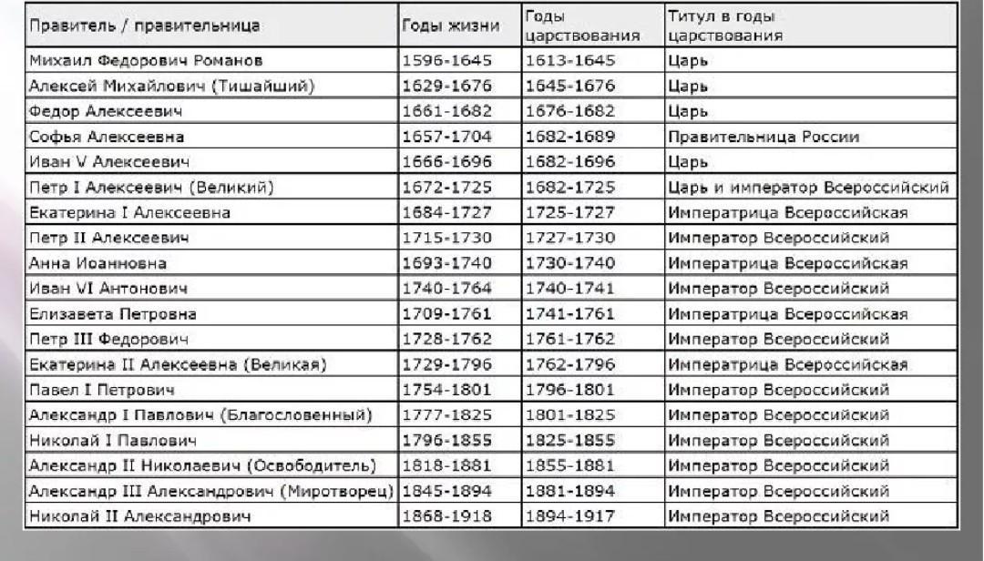 Вот все правители Российской империи начая с Михаила Фёдоровича заканчивая Николаем вторым
