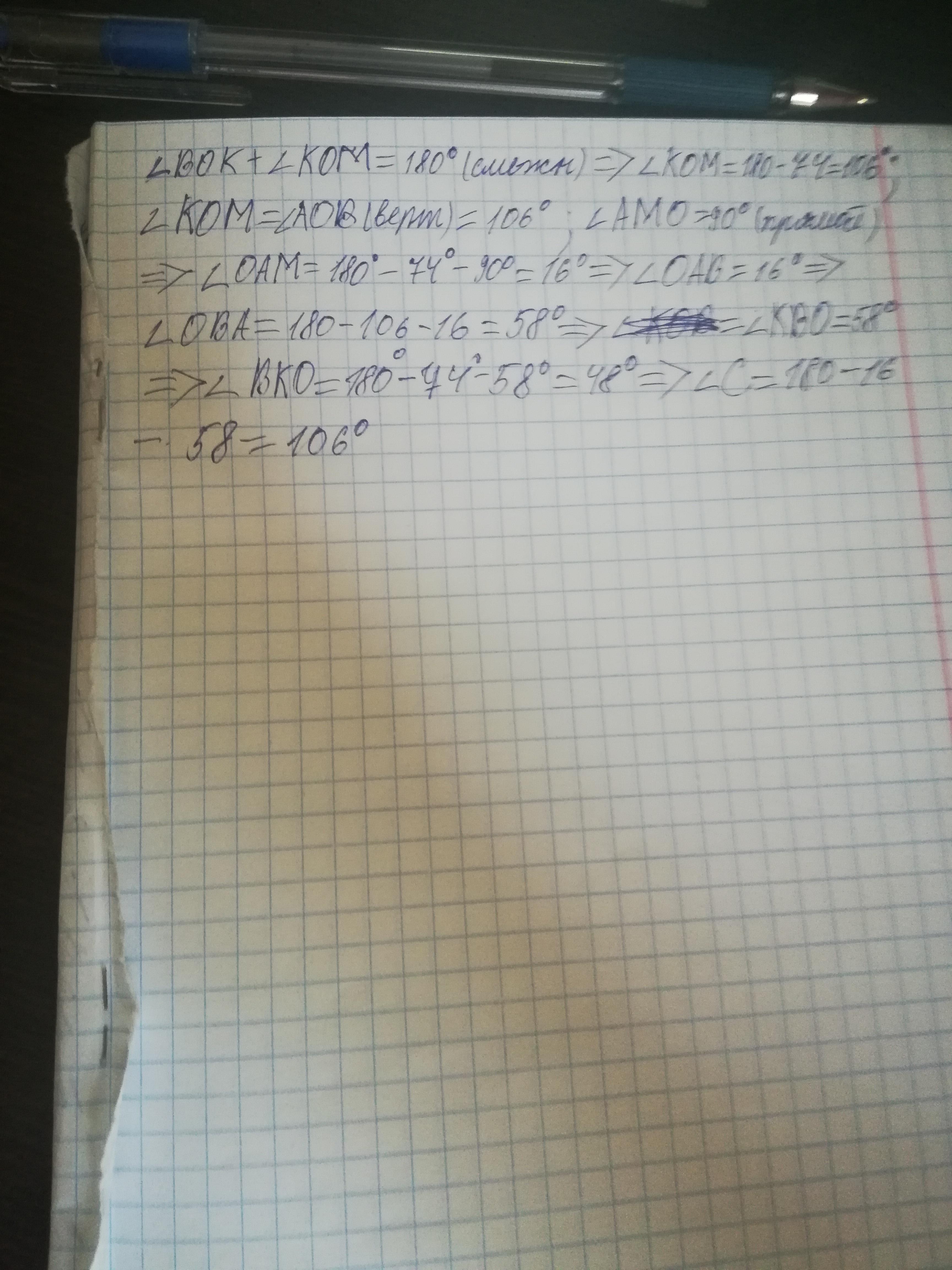 Из ΔАВО ∠АОВ=180°-(х+у), с другой стороны, ∠АОВ=180°-∠ВОК=180°-74°=106° (по свойству смежных), тогда