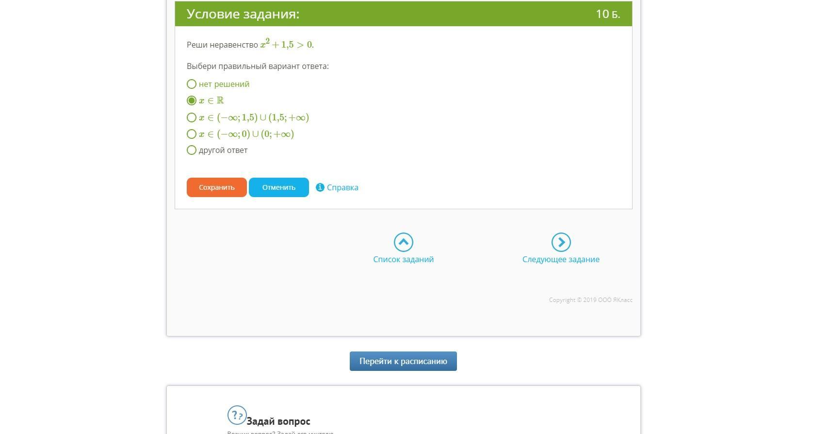 1. х²+1.5>0 левая часть - это сумма неотрицательного числа и положительного, как известно - есть число положительное, поэтому в качестве ответа берем х∈R