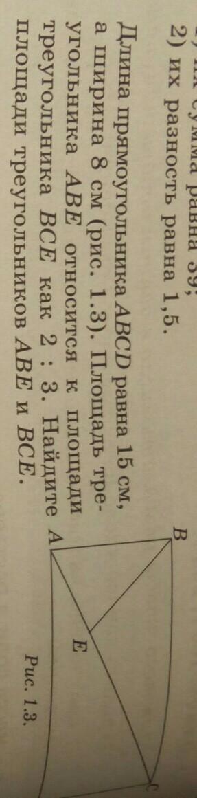 Пусть х - площадь ΔАВЕ , тогда 1,5х - площадь ΔВСЕ