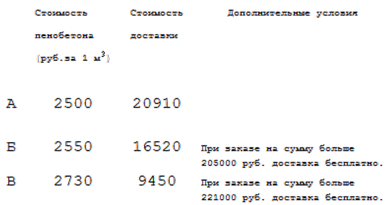 Строительной фирме нужно приобрести 80 кубометров пенобетона у одной из трех поставщиков. Цены и условия доставки приведены в таблице. Сколько рублей придется заплатить за самую дешевую покупку с доставкой?
