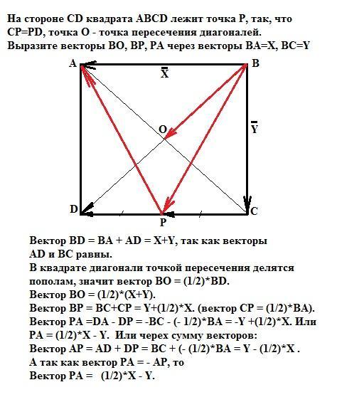 На стороне CD, на стороне квадрата ABCD лежит точка P, так, что CP=PD, тоска о пересечения диагонали. Выразите векторы BO, BP, PA через векторы BA=X, BC=Y