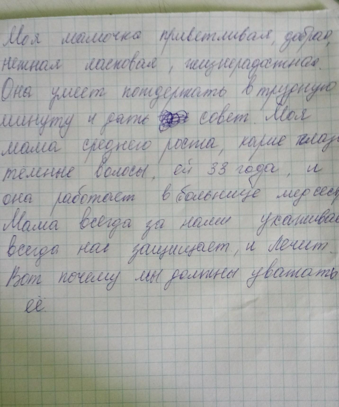 менің анам мейірімді, ақкөңіл, мейірімді, өмірде қуанышты, қиын кезеңдерге төтеп беріп, кеңестер бере алады.және ақыл-кеңес беріңіз, менің анам орта бойлы, қоңыр көзді оның қара шашы 33 жаста және ол ауруханада жұмыс істейді, медбике, мама әрқашан бізге қамқорлық жасайды, әрқашан қорғайды және емдейді, сондықтан біз оны құрметтеуіміз керек.