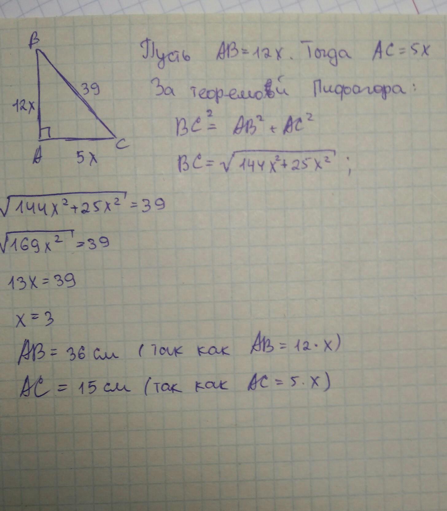 Дан прямоугольный треугольник АВС,отношение катетов в нём 12:5,гипотенуза равна 39 см.Найти неизвестные стороны треугольника