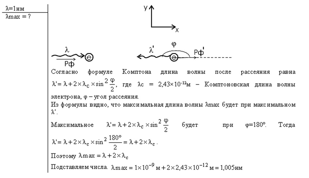 Рентгеновское излучение (лямбда=1 нм) розсеивается электронами, их можна считать практично свободными. Определить максимальнуюдлину волнырентгеновского излучения в россеяном пучьке.