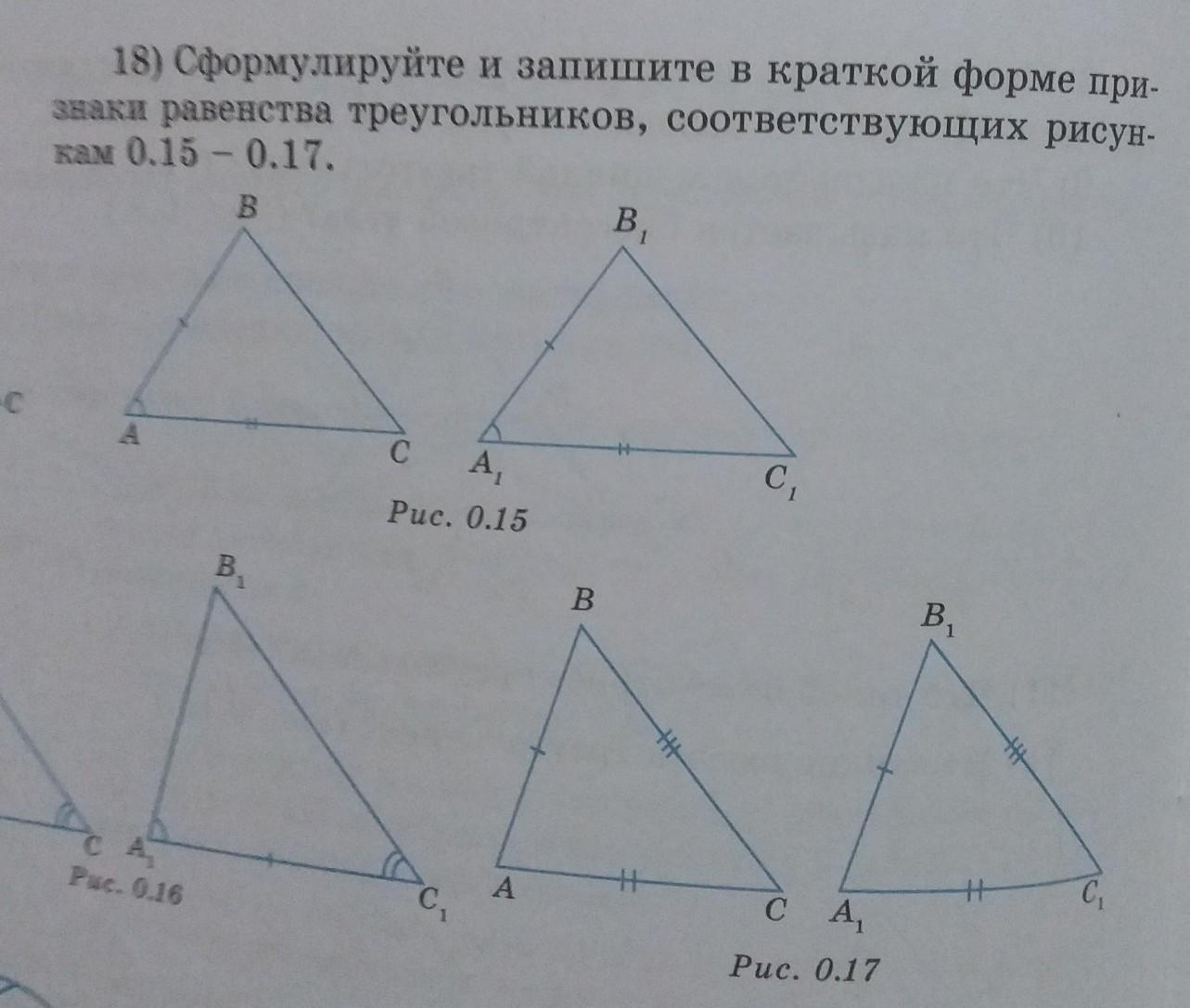 сформулируйте и запишите в краткой форме признаки равенства треугольника , соответствующих рисункам