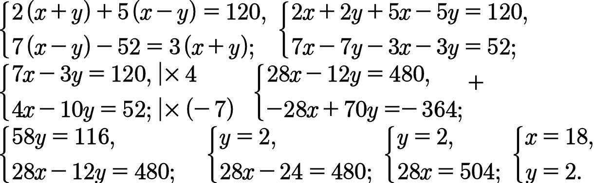 За 7 часов против течения лодка проплыла 7(х - у) км, за 3 часа по течению - 3(х + у) км. Так как 7(х - у) больше чем 3(х + у) на 52, имеем второе уравнение: 7(х - у) - 52 = 3(х + у).
