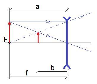 Решим задачу аналитически. Найдем расстояние от линзы до изображения спички. Формула линзы имеет вид (см. рисунок) 1/f = 1/a + 1/b. Отсюда b = f*a/(a-f). Т.к по условию модули f и a равны между собой, и фокусное расстояние отрицательное, то можно принять, что b = f²/2f = f/2. Отношение размера спички к её изображению равно отношению f к b и равно f/(f/2) = 2f/f = 2. Отсюда следует, что изображение спички в 2 раза меньше самой спички. Значит размер изображения спички = 5/2 = 2,5 см.