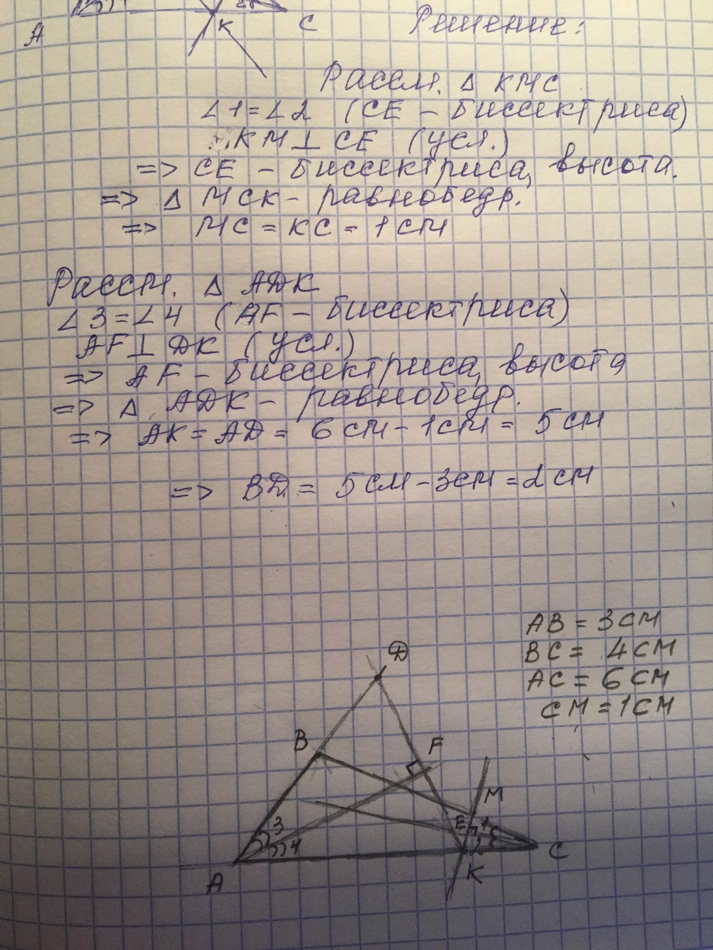 « В треугольнике ABC известно что AB=3cm, BC=4cm, AC=6cm. На стороне BC лежит точка М так, что CM=1cm. Прямая, проходящая через точку М перпендикулярна биссектрисе угла ACB, пересекая сторону AC в точке К. Прямая, проходящая через точку K перпендикулярна биссектрисе угла BAC, пересекая сторону AB в точке D. Найдите отрезок BD( чему он равен).»