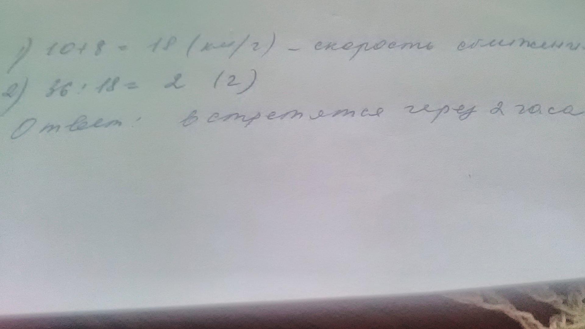 Два велосипедиста выехали одновременно на встречу друг друга из двух пунктов расстояние между которыми 36 км . Скорость первого 10 к/ч, а второго 8 км/ч .Через сколько часов они встретятся ?