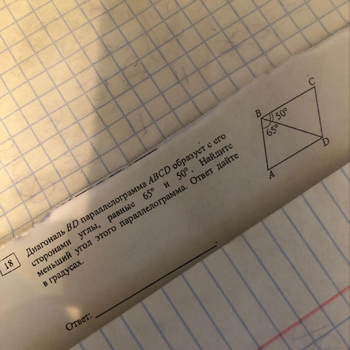 Диагональ BD параллелограмма ABCD образует с его сторонами углы, равные 65* и 50* градусов. Найдите меньший угол этого параллелограмма. Ответ дайте в градусах.
