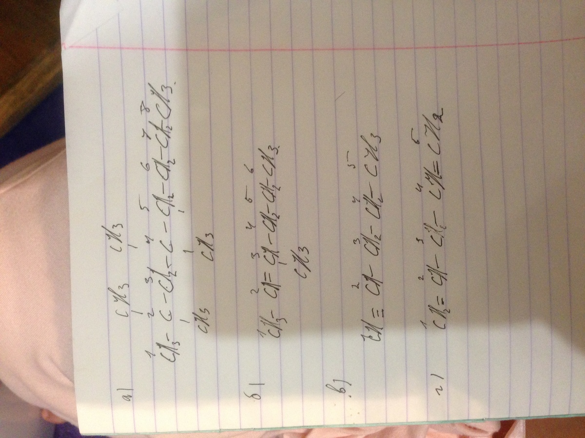 Номер 3 реакция: CH4 + 3Cl2 = 3HCl + CHCl3 По уравнению видно, что на 1 моль метана тратится 3 моль хлора. А по закону Авогадро молярные отношения газов равны их объёмным отношениям. Значит, хлора потребуется втрое больше - 33,6 л. Задание номер 2:н-Гексан CH3CH2CH2CH2CH2CH3 2-Метилпентан (изогексан) CH3CH(CH3)CH2CH2CH3 3-Метилпентан CH3CH2CH(CH3)CH2CH3 2,3-Диметилбутан (диизопропил) CH3CH(CH3)CH(CH3)CH3 2,2-Диметилбутан (неогексан) CH3C(CH3)2CH2CH3 Пентан CH3—CH2—CH2—CH2—CH3 Гептан CH3—CH2—CH2—CH2—CH2—CH2—CH3. Но второе не думаю что точно правильно (