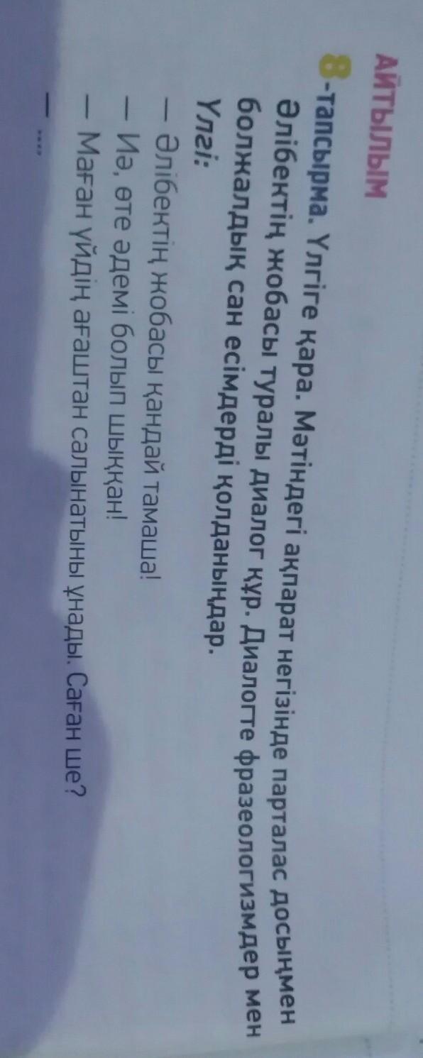 2. # С 30% 0 21:44 вечера ... РАЗДЕЛ 8 Задание. Смотрите шаблон. На основании информации в тексте расскажу о проекте партнера выпускника Алибека. Используйте фразеологические и числовые имена в диалоге. Шаблон: Какой замечательный проект в Альбукерке! - Да, это красиво! Мне понравилось то, что дом сделан из дерева. Как насчет вас