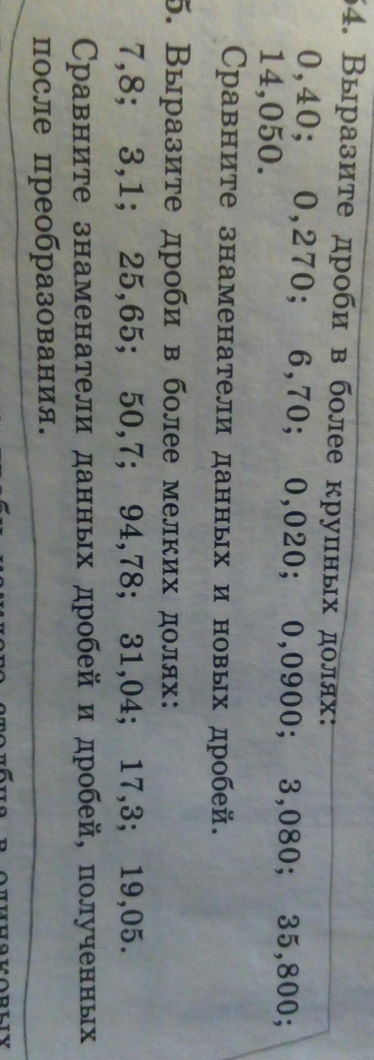 54. Выразите дроби в более крупных долях: 0,40; 0,270; 6,70; 0,020; 0,0900; 3,080; 35,800; 14,050. Сравните знаменатели данных и новых дробей.