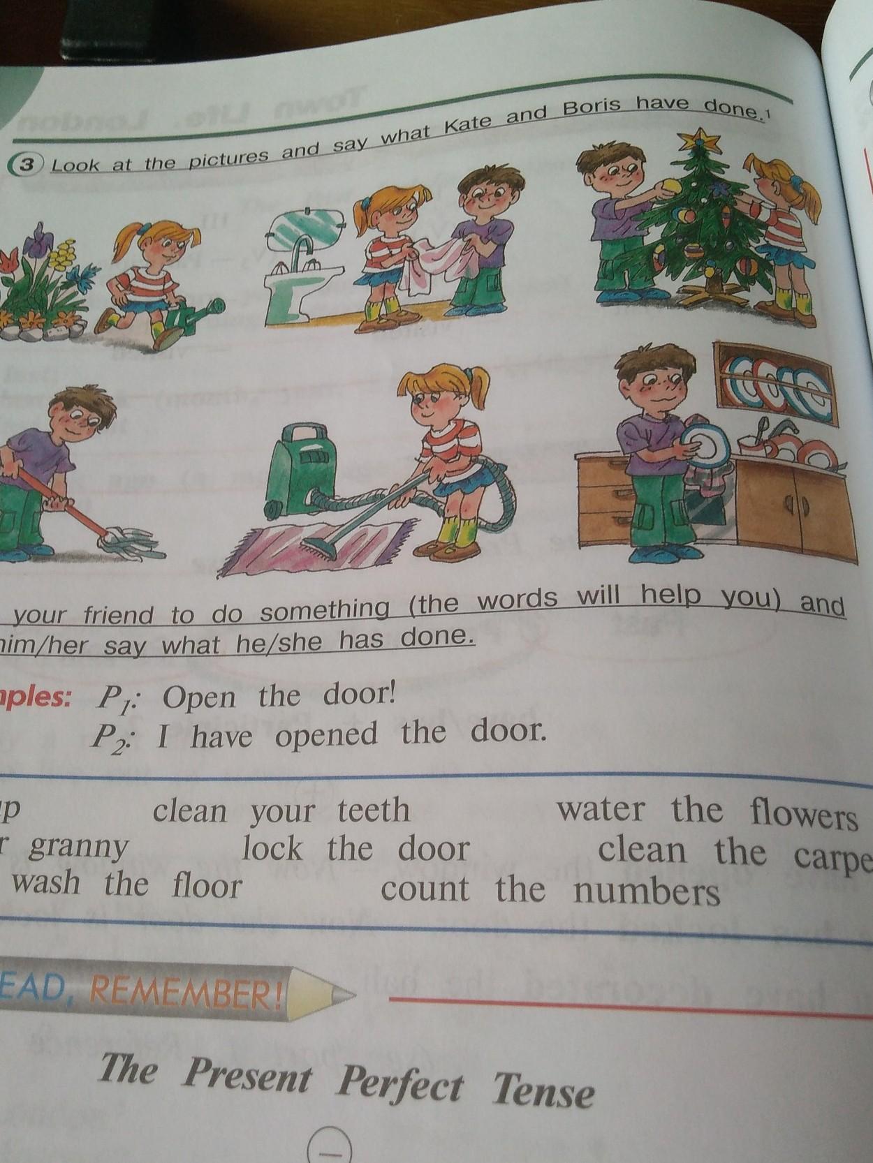 Katya walked flowers. Katya and Boris kept a towel. Katya and Boris died a Christmas tree. Boris sweeped. Katya dust. Boris Soap dishes.