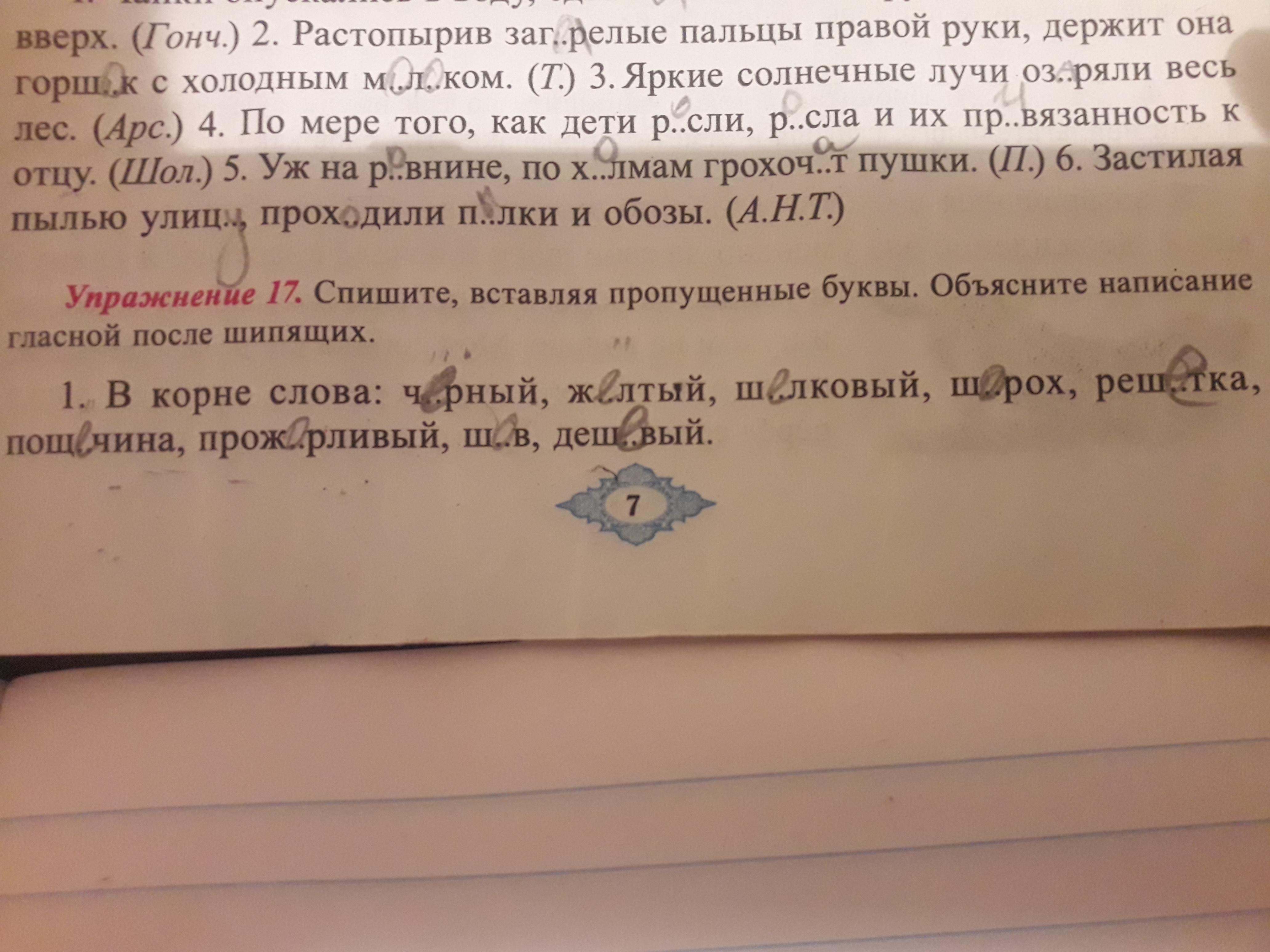 Чёрный (под ударением), жёлтый (под ударением), шёлковый (под ударением), шорох (исключение) , решётка (под ударением), пощёчина (под ударением), прожорливый (исключение), шов (исключение), дешёвый (под ударением).