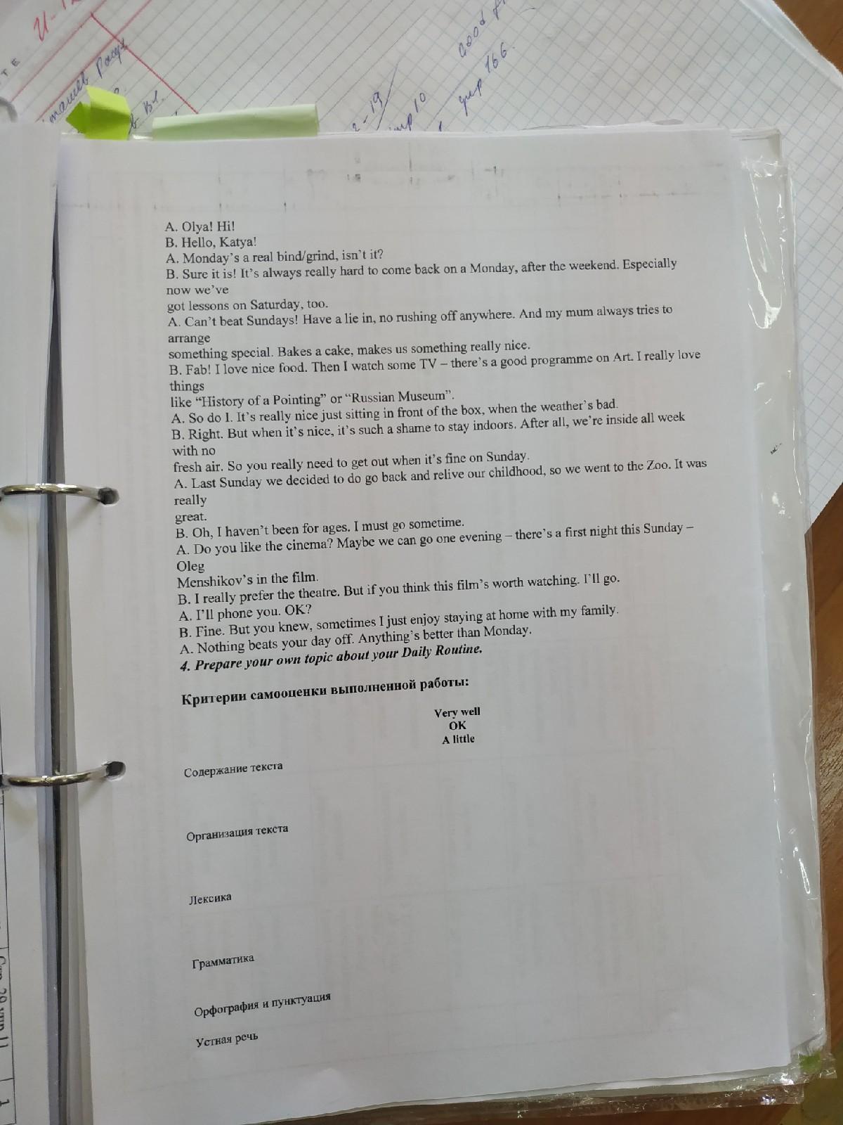 A.Olya! Привет! Б. Привет, Катя! А. Понедельник - это настоящая связь, не так ли? Б. Конечно, это так! Возвращаться в понедельник после выходных очень сложно. Особенно сейчас у нас есть уроки в субботу тоже. А. Не воскресенья! Врать, никуда не спешить. И моя мама всегда старается устроить что-то особенное. Выпекает пирог, делает нам что-то действительно хорошее. Б. Потрясающе! Я люблю хорошую еду. Потом я смотрю телевизор - на Art есть хорошая программа. Я действительно люблю такие вещи, как «История указывания» или «Русский музей». А. Так же, как и Л. Очень приятно просто сидеть перед плохой погодой. Б. Верно. Но когда это хорошо, это так в помещении. В конце концов, мы внутри всю неделю без свежего воздуха. Так что вам действительно нужно уйти, когда все будет хорошо в воскресенье А. В прошлое воскресенье мы решили вернуться и пережить наше детство, поэтому мы пошли в зоопарк. Это было действительно здорово Б. О, я не был целую вечность. Я должен идти когда-нибудь. А. Тебе нравится кино? Может быть, мы можем пойти однажды вечером - в это воскресенье будет первая ночь - Олег Меньшиков в фильме. Б. Я действительно предпочитаю театр. Но если вы считаете, что этот фильм стоит посмотреть, я пойду. А. Я позвоню тебе ОК? Б. Хорошо. знал, иногда я просто моя семья А. Ничто не сравнится с твоим выходным. Все лучше, чем понедельник.