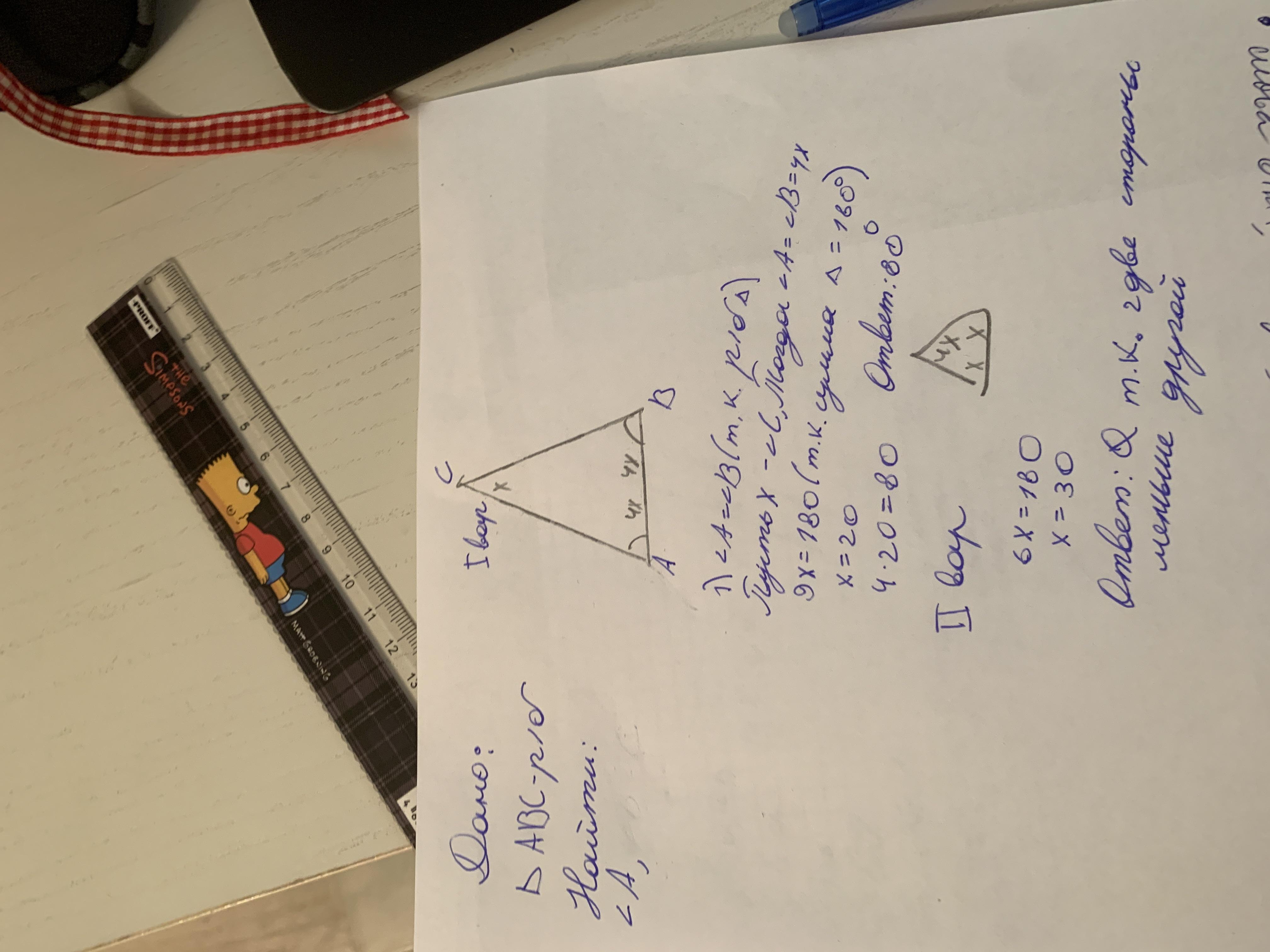Т.к суммам углов ровна 180°, то величина угла при основании будет ровна 180° ÷ 3 = 30°