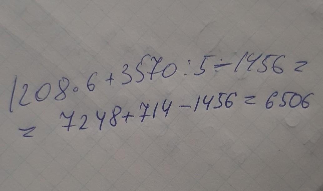Пошаговое объяснение:1208*6=7248, 3570/5=714, 7248+714-1456=6506