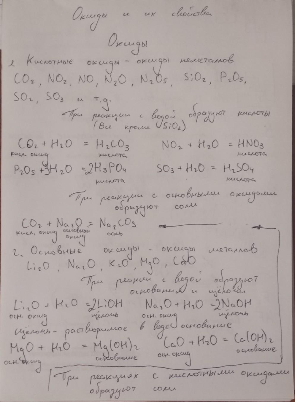Всё на фотографиях, обратите внимание что я описал лишь часть оксидов и немного их свойств, есть ещё один класс оксидов, они называются амфотерные, но для начала немного разберитесь с кислотными и основными оксидами. Давая примеры реакций используйте типичные металлы(1 и 2 главные группы таблицы Менделеева) и неметаллы (практически все кроме инертных газов)