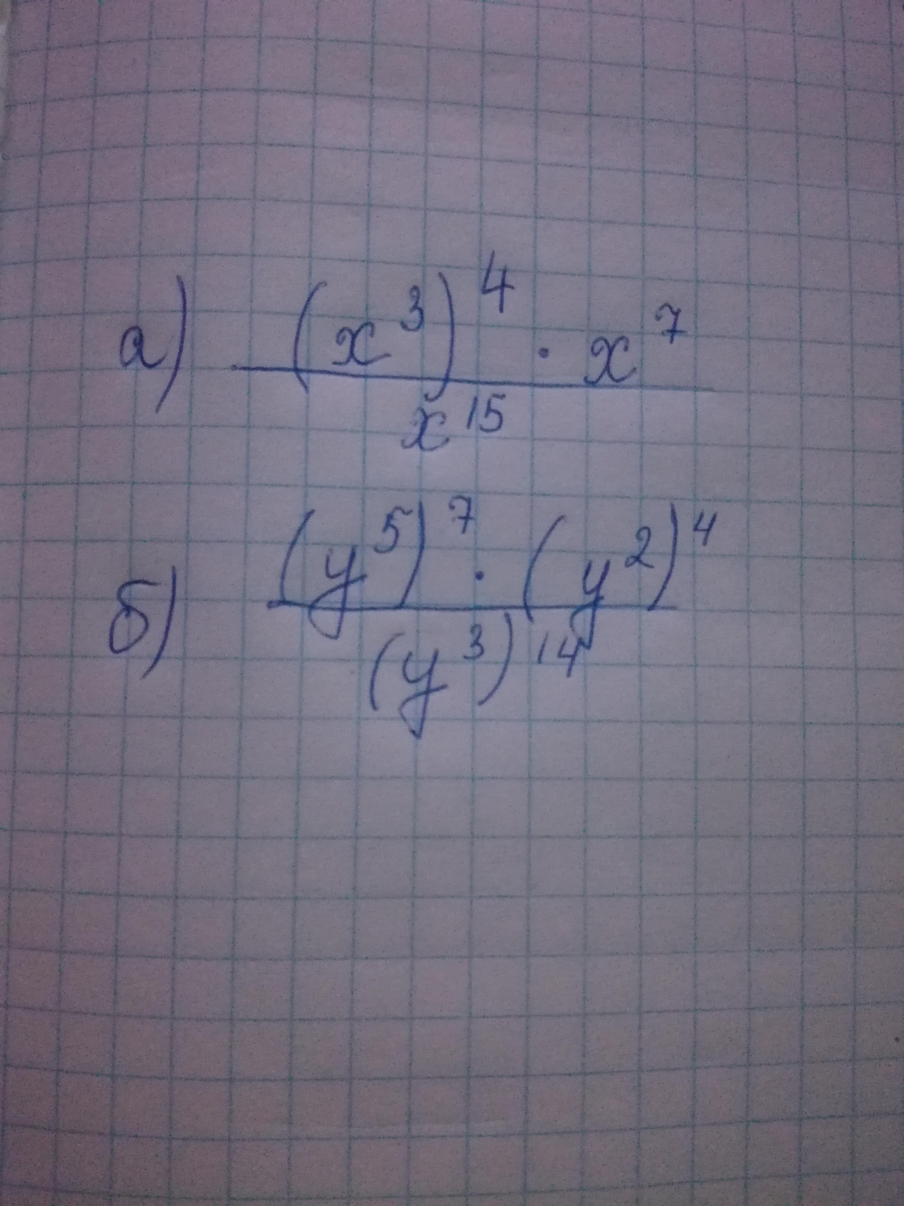 \frac{(x^3)^4\, \cdot \, x^7}{x^{15}}=\frac{x^{12}\, \cdot x^7}{x^{15}}=\frac{x^{19}}{x^{15}}=x^4\\\\\\\frac{(y^5)^7\, \cdot (y^2)^4}{(y^3)^{14}}=\frac{y^{35}\, \cdot \, y^{8}}{y^{42}}=\frac{y^8}{y^7}=y
