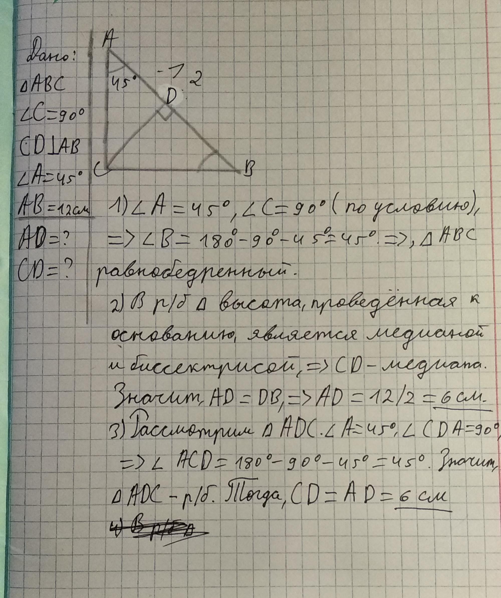 в прямоугольном треугольнике abc с прямым углом c проведена высота cd Угол при вершине А равен 45 градусам. Гипотенуза 12 см. Найти AD и CD