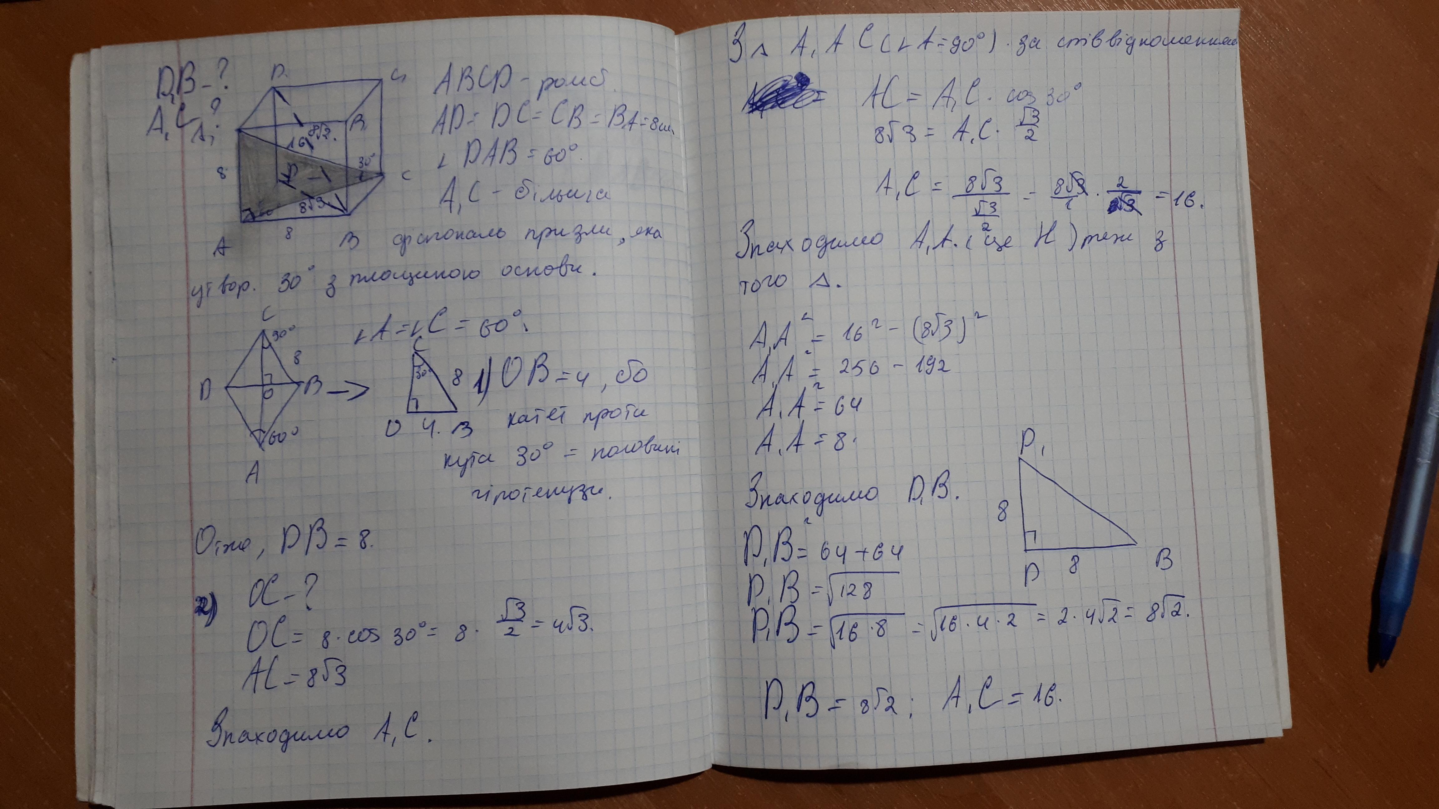 СРОЧНО! ГЕОМЕТРИЯ!Основою призми є ромб зі стороною 8 см і гострим кутом 60°. Кут між більшою діагоналлю призми і площиною основи дорівнює 30°. Знайдіть довжини діагоналей призми.