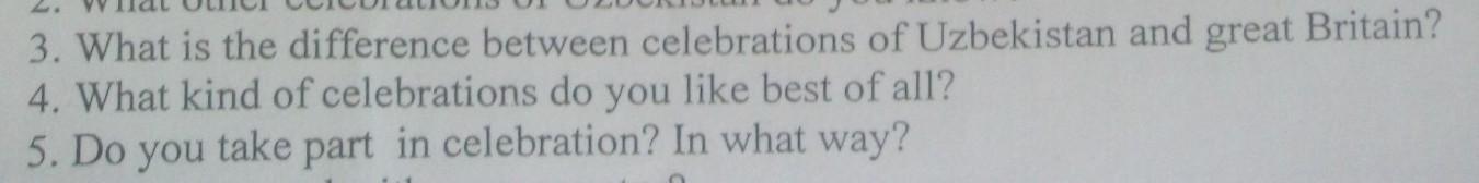 3) Let's give an example about the New Year. Many people in Uzbekistan try to manage to eat 12 grapes before midnight. The one who performs this ritual believes that desire will come true. Great Britain has its own traditions. For example, there is a rule of the first step, the man who first entered the threshold of the house on New Year's Day will bring happiness, but this man must be a brunette.