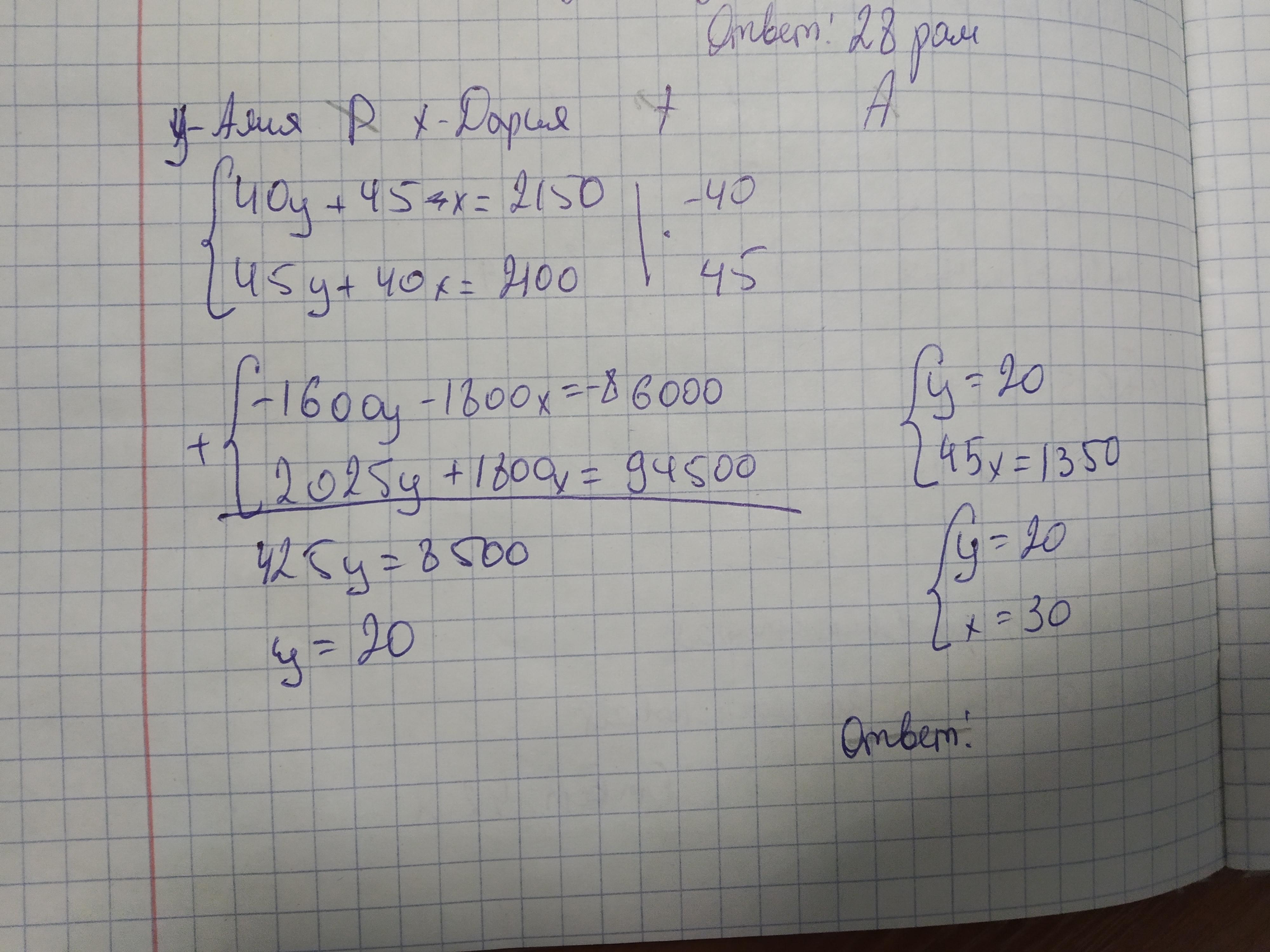 Алия и Дария решили купить подарок для Дамира. Если Алия внесет 40%, а Дария 45% всех своих денег, то общая сумма составит 2150 тенге. Если же Алия внесет 45%, а Дария 40%, то общая сумма составит 2100 тенге. Сколько денег у Алии и сколько денег у Дарии?