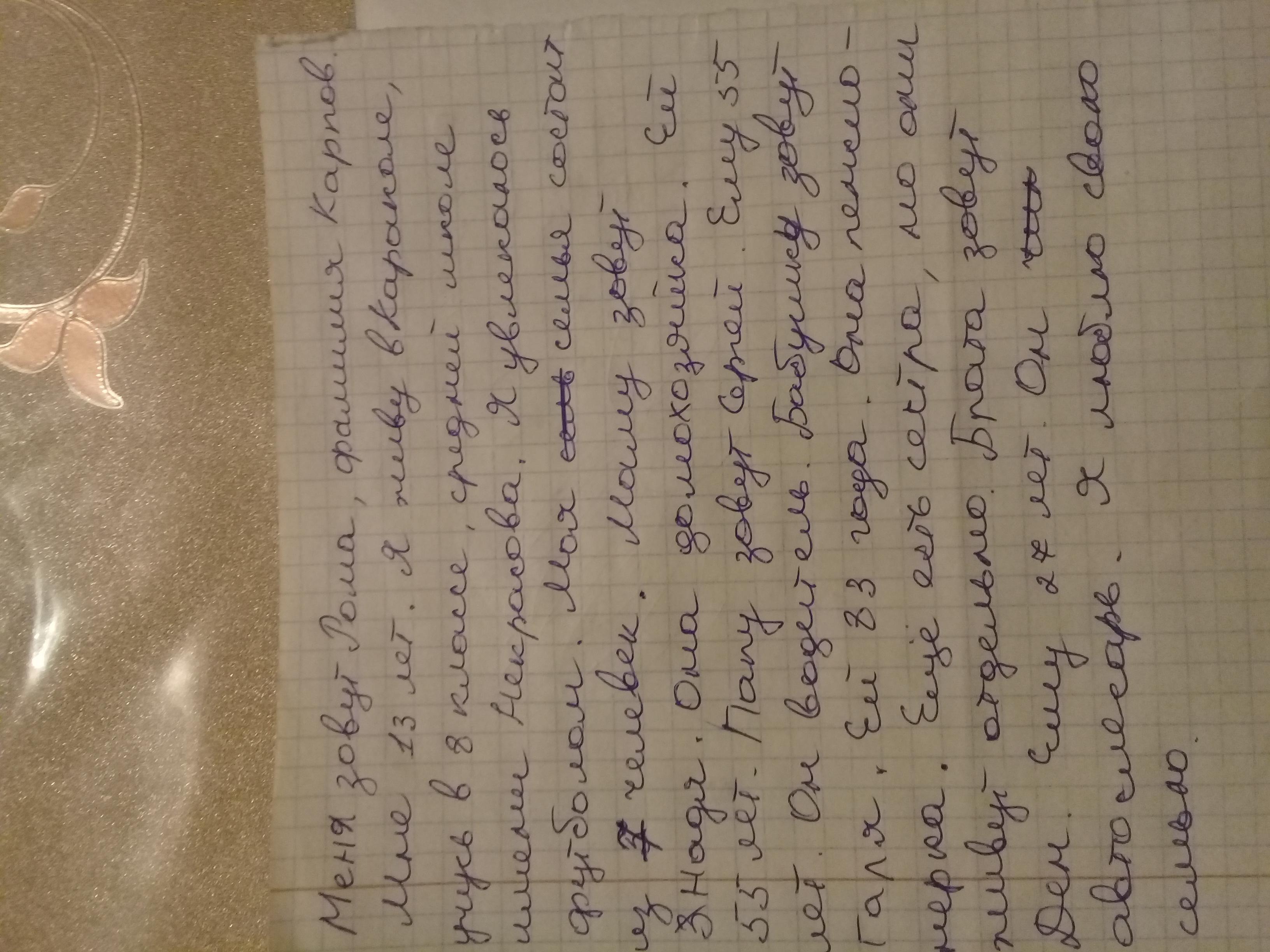 Менин атым Рома, фамилиям Карпов. Мен 13 жаштамын. Мен Караколдо жашайм, 8 класста окуйм, Некрасова атындагы орто мектебинде. Мен футболго кызыгам. Менин үй бүлөм 7 адамдан турат. Апамдын аты Надя. Ал үй иштерин жасайт. Ал 55 жашта. Атамдын аты Сергей. Ал 55 жашта. Ал айдоочу. Чоң апамдын аты Галя. Ал 83 жашта. Ал пенсионер. Дагы эжем бар, бирок ал биз менен жашабайт. Байкемдин аты Ден. Ал 27 жашта. Ал автослесар ( извини я не как переводится это слово). Мен үй бүлөмдү жакшы көрөм