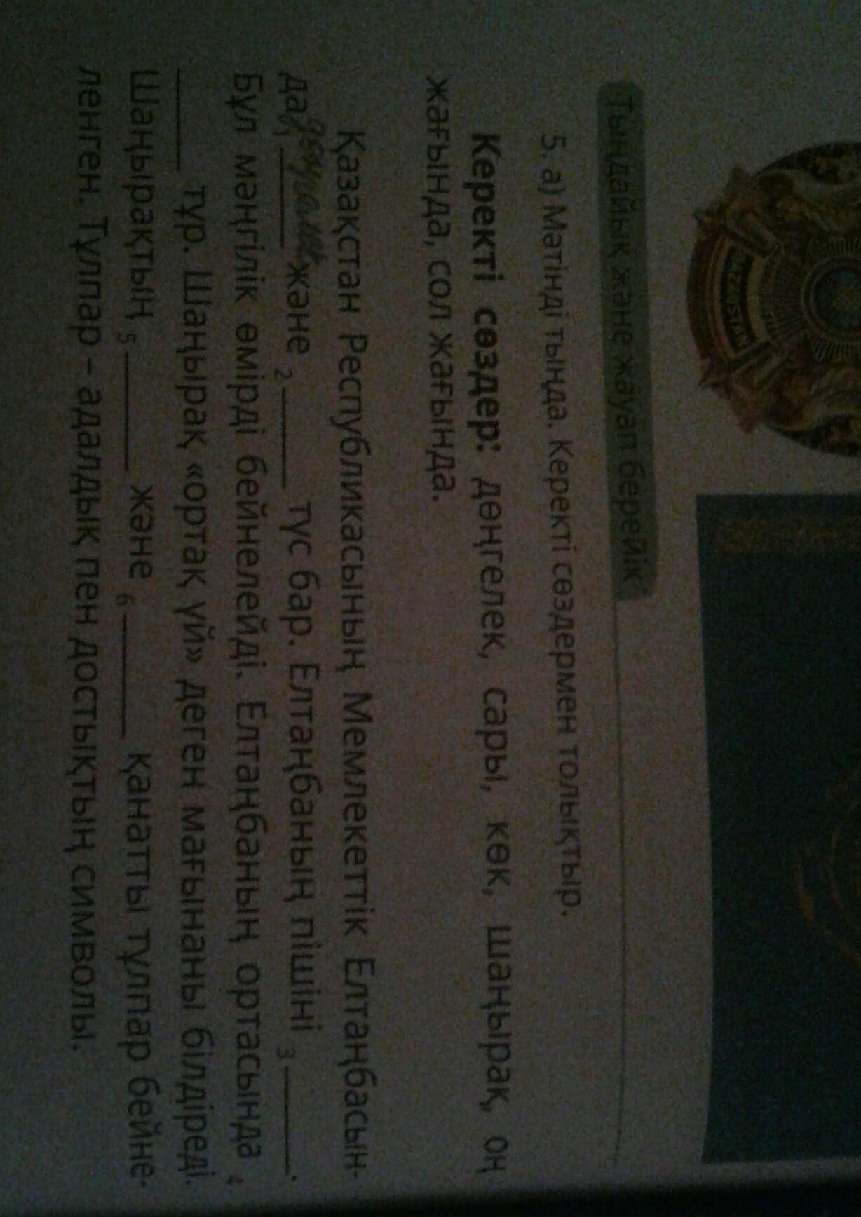 1.Сары жане көк тусі бар. 3.шаңырақ.5.оң жағында.6.сол жағында