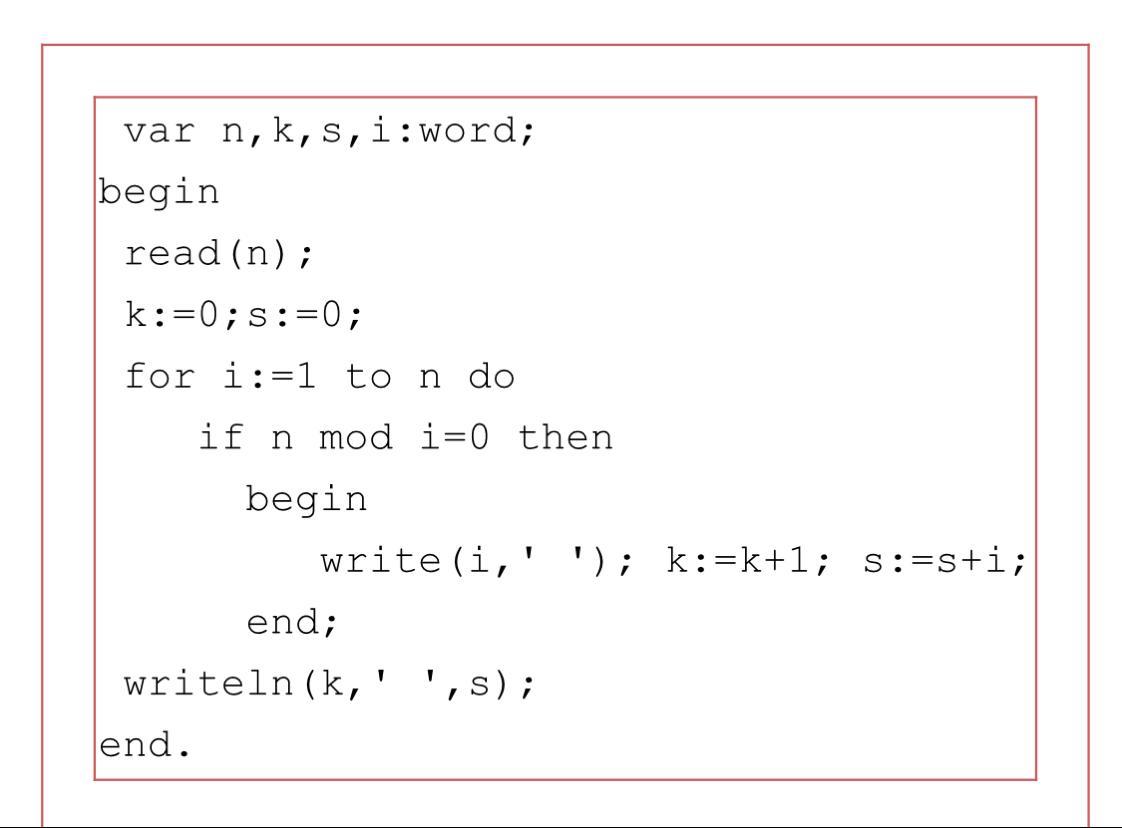 Переведите этот код из Паскаля в С#!!!!!Срочно!!!!Если,что то это задача на нахождение количества и суммы делителей числа n!