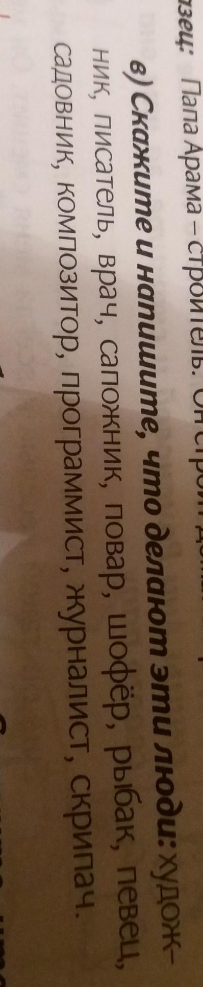 Художник-рисует, писатель-пишет, врач-лечит, сапожник- делает обувь, повар-готовит еду, шофёр- водит машину, рыбак- ловит рыбу, певец-поёт, садовник- занимается садом, композитор- сочиняет музыку, программист-программирует, журналист- пишет газеты, скрипач- играет на скрипке.