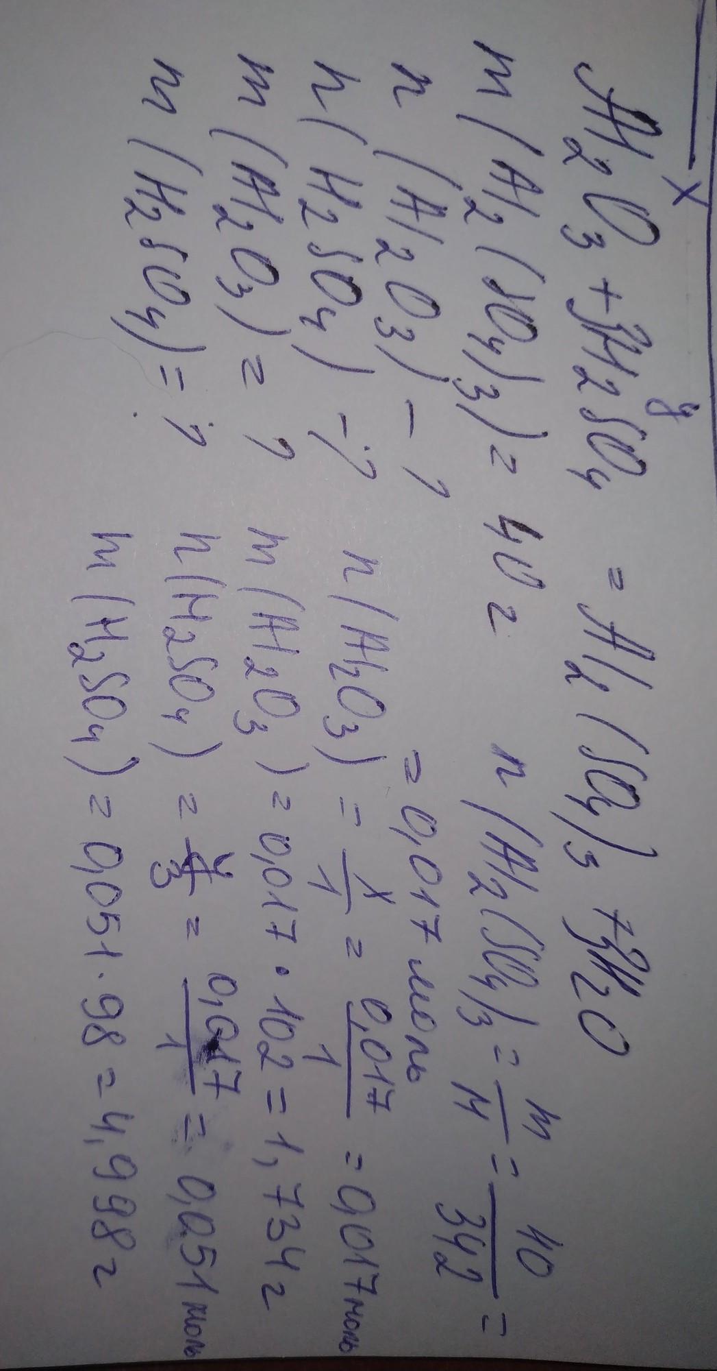 При взаимодействии Al3O2 с серной кислотой образовалось 40 грамм сульфата алюминия, рассчитать массу и количество, вступивших в реакцию