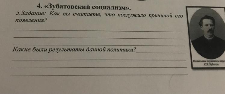 Идея "Зубатовского Социализма" принадлежит С. В. Зубатову, по инициативе которого она была воплощена с помощью Великого князя Сергея Александровича. Зубатов предложил создать ряд легальных рабочих организаций. В рамках этих организаций рабочим было позволено участвовать в Экономических митингах, что мягко говоря не понравилось предпринимателям а вслед за ними и правительству. В результате Зубатов был уволен с должности, а ситуация с революцией только ухудшилась.
