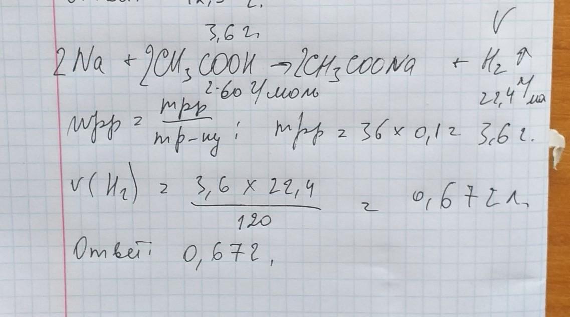 Об'єм водню утвориться під час взаємодії натрію з розчином етанової кислоти масою 36г з масовою часткою 10%