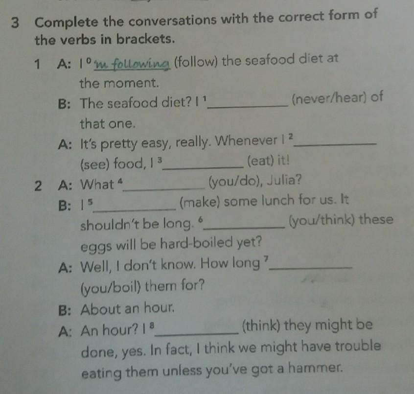 B: I 5 (am making) some lunch for us. It shouldn't be long. 6 (Do you think) these eggs will be hard-boiled yet?