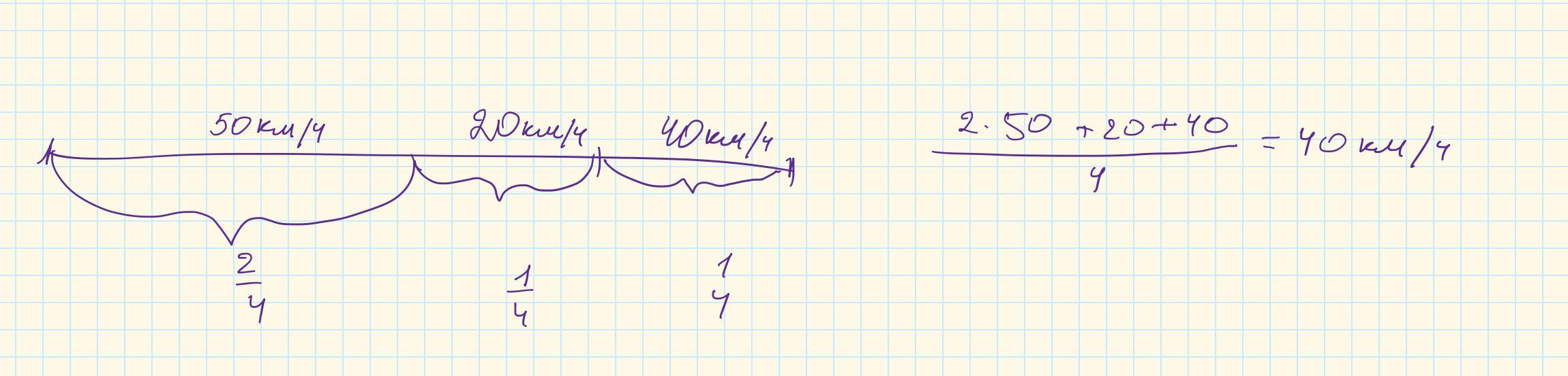 Квадроцикл проїхав половину шляху зі швидкістю 50 км/год. Половину часу, який залишився, він їхав зі швидкістю 20 км/год, арешту — зі швидкістю 40 км/год. Визначте середню швидкість руху квадроцикла на всьому шляху.