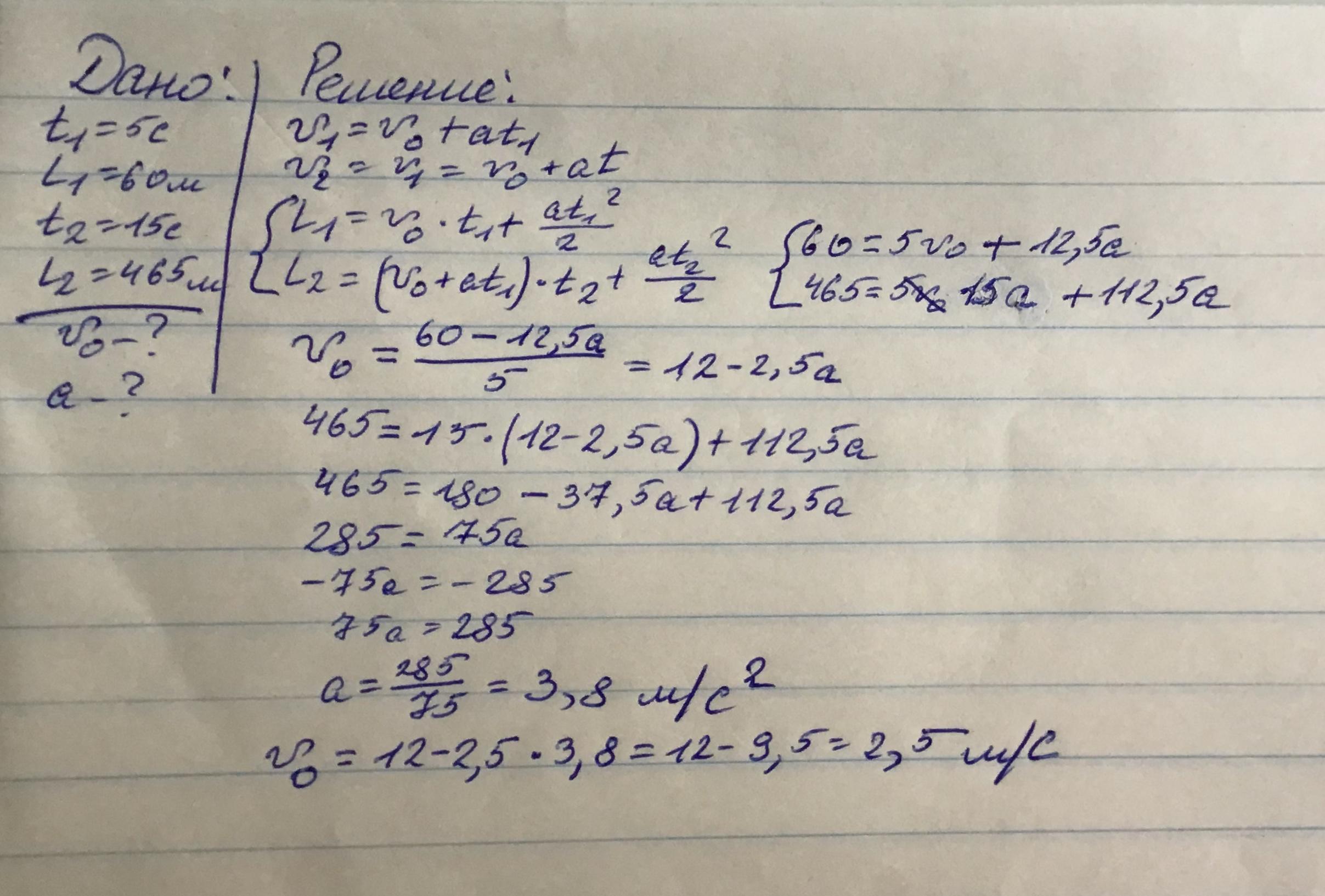 Грузовик, имея некоторую начальную скорость, начал двигаться равноускоренно: за первый промежуток времени, равный t1=5 с, прошёл l1= 60 м, а за второй промежуток времени, равный t2=15 с, — l2=465 м.