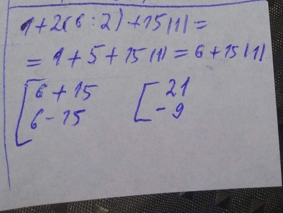 1+2(6:2)+15|1|=1+2*3+15*1=7+15=22